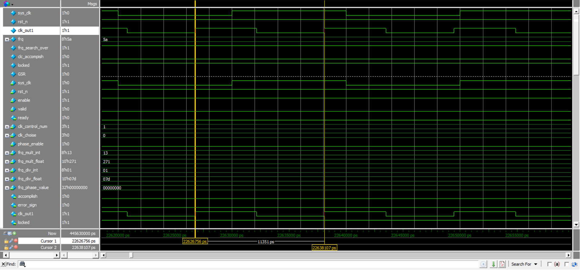 这个是写一次后,locked 信号拉高后,输出信号周期为 11351ps,计算得为 88.097MHz 接近 88.1MHz。